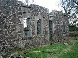 In 1615 William Montgomerie, a merchant, lived at Rakerfield that was situated just off the above-mentioned old drove road that once formed a direct route from Beith to Howwood.[7] Rakerfield Farm was a two storey dwelling of unusual construction, with well carved stone window and door surrounds, etc. It was once used as hunting lodge and a dwelling for a gamekeeper. Mrs & Mrs Blair, lived here at the time of the construction of Kirkleegreen Reservoir and it was purchased upon their death by Ayrshire County Council who the roof removed.
