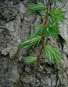 It is a medium-sized to large deciduous coniferous tree reaching 20–40 m tall, with a trunk up to 1 m diameter. The crown is broad conic; both the main branches and the side branches are level, the side branches only rarely drooping. The shoots are dimorphic, with growth divided into long shoots (typically 10–50 cm long) and bearing several buds, and short shoots only 1–2 mm long with only a single bud. The leaves are needle-like, light glaucous green, 2–5 cm long; they turn bright yellow to orange before they fall in the autumn, leaving the pinkish-brown shoots bare until the next spring.[3]
