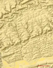 The Larrys Creek watershed has two deposits of low volatile bituminous coal along Roaring Run[30] and a small, deep natural gas field.[31] A potentially large source of natural gas is the Marcellus Shale, which lies 1.5 to 2.0 miles (2.4 to 3.2 km) below the surface here and stretches from New York through Pennsylvania to Ohio and West Virginia. Estimates of the total natural gas in the black shale from the Devonian era range from 168 to 516 trillion cubic feet (4.76 to 14.6 trillion m3), with at least 10 percent considered recoverable.[32][33] In November 2007, drilling within the Larrys Creek watershed started in Mifflin Township, just west of Salladasburg, with a 1.5 miles (2.4 km) deep well.[34] A second well was drilled in Mifflin Township in December 2007,[35] and by February 2008 every well drilled in Lycoming County was producing natural gas.[36] The Marcellus Shale requires special techniques to fracture the rock and release the gas, including pumping sand and water into the well, and, in some cases, horizontal drilling.[37]