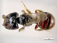 Lasioglossum hemichalceum, which has sometimes been confused with L. erythrurum,[1] is a sweat bee endemic to Australia.[2] Large numbers of unrelated females will typically share a single nest, a behavior referred to as "communal".[3] Nests are constructed underground by the independent efforts of the females.[4] L. hemichalceum will typically begin creating new colonies during the summer,[5] with brood production from late November through the first few months of spring.[6] Members of this species do not demonstrate aggressive behavior towards one another.[7] As the size of the colony increases, the reproductive potential of each female does not change, unlike many species of bees.[5]