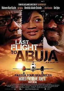 Last Flight to Abuja is a 2012 Nigerian disaster thriller film written by Tunde Babalola, directed and produced by Obi Emelonye, and starring Omotola Jalade Ekeinde, Hakeem Kae-Kazim and Jim Iyke. Shot in Lagos, the film received 5 nominations at the 2013 Africa Movie Academy Awards, winning the category "Best film by an African based abroad".[2][3][4] On 15 June 2020, 'Last Flight To Abuja' began streaming on Netflix eight years after it first premiered in London.[5]