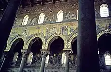 With the political stability brought about by the Frankish conquest of Italy there was a new burst of production of major Roman mosaics in the Carolingian period.[21] The great hall (triclinium) of the Lateran Palace had religious mosaics in its apse-like semi-dome which survive, now moved outside and very heavily restored.[22] Five churches in Rome have mosaics from this period:Santi Nereo e Achilleo (c. 814) has an iconographically eccentric programme at the east end, while Santa Prassede and Santa Cecilia in Trastevere (both c.820) and San Marco (commissioned between 828 and 848) all have semi-domes following that of Santi Cosma e Damiano (526-30 - above) with Saints Peter and Paul presenting martyrs and the donor Pope carrying a model of the church.[23] Santa Maria in Domnica (c. 820) has an enthroned Madonna and Child in the midst of saints and angels.