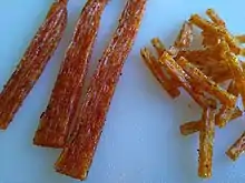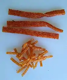 Latiao (simplified Chinese: 辣条; traditional Chinese: 辣條; lit. 'Spicy stick/spicy strip') is a popular Chinese snack. The main raw materials are wheat flour and chili. After adding water, salt, sugar, natural pigment and other surface, the flour is extruded under high temperature, then mixed with chili and other seasonings including preservatives whose component matches Chinese food additive standard GB2760.[1]