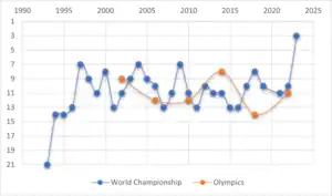 Graph shows Latvian results in IIHF World Championship since 1993.