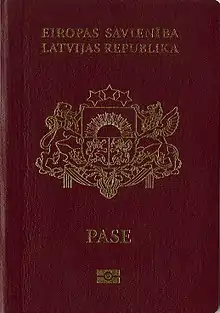 Latvian passports are burgundy red, with the Coat of arms of Latvia emblazoned in the center of the front cover. The words EIROPAS SAVIENĪBA (Latvian for "European Union") and LATVIJAS REPUBLIKA (Latvian for "Republic of Latvia") are inscribed above the coat of arms, and the word PASE (Latvian for "Passport") below. The Latvian passport has the standard biometric symbol emblazoned below the coat of arms and uses the standard European Union design.