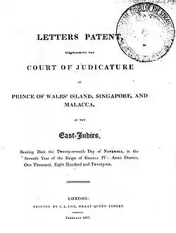 - ↑ The First Charter of Justice of 1807 applied only to Prince of Wales' Island (Penang).