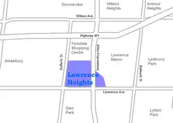 Lawrence Heights is a neighbourhood in Toronto, Ontario, Canada. It is located north-west of central Toronto, in the district of North York. The neighbourhood is roughly bounded by Lawrence Avenue to the south, Yorkdale Road to the north, Varna Drive to the east and Dufferin Street to the west. It is part of the greater Yorkdale-Glen Park official Toronto neighbourhood.