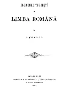 By that moment in his career, Șăineanu was also publishing several books on comparative linguistics. Initially, he focused on assessing the impact of Turkish and Ottoman Turkish on the mainly Romance Aromanian language, producing the 1885 study Elemente turcești în limba aromână ("Turkish Elements in the Aromanian Language").[31] In 1889, he published his innovative work on the links between German and Yiddish, Studiu dialectologic asupra graiului evreo-german ("A Dialectologic Study on Judeo-German Speech").[32] His recognized field of expertise, Nastasă notes, was by then the widest in Romania, comprising not just Yiddish and Romance linguistics, but also the study Proto-Indo-European, Proto-Slavic and various other languages and dialects.[33]