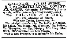 The play was translated into English by Thomas Holcroft,[3] and under the title of The Follies of a Day – Or The Marriage of Figaro it was produced at the Theatre Royal, Covent Garden in London in late 1784 and early 1785.[11] In France the play has held its place in the repertory, and leading companies have played it in the original language to audiences in Europe and America.[12] In 1960 a Comédie Française production was filmed, under the direction of Jean Mayer, with Jean Piat as Figaro.[13]