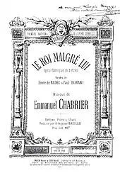 Le roi malgré lui (King in Spite of Himself or The reluctant king) is an opéra-comique in three acts by Emmanuel Chabrier of 1887 with an original libretto by Emile de Najac and Paul Burani.[1] The opera is revived occasionally, but has not yet found a place in repertory.