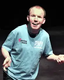 ![]() Lost Voice Guy performing stand-up at the Northern Stage, Newcastle | |