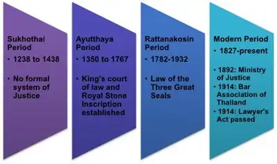 The ancient origins of Thai Law was based on the Hindu code of Manu. During the Sukhothai period (1238–1350 AD),[2] there was no system of Justice since the King was "the Fountain of Justice" who alone settled disputes between the people.