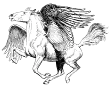 An origin evoked by Désiré Monnier for the winged and flying horses is that of Pegasus of Greek mythology, who would have "left his footprints all over the Jura region". The castle of the Jura eagle could be likened to Mount Olympus and the top of a mountain near Foncine-le-Haut to the Greek Mount Parnassus.[42][43] The origin of the image of the "winged horse on top of a mountain" is, according to him, clearly linked to the myth of Pegasus. The riding sylph of Bonlieu recalls the Greek hero Bellerophon, who rode Pegasus and fell while trying to reach Olympus, and then ended up wandering on foot in the deserts, racked with worries and avoiding encounters.[44]