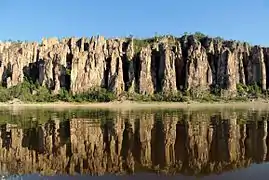 The Lena Pillars (Russian: Ле́нские столбы́, tr. Lenskiye Stolby; Yakut: Өлүөнэ туруук хайалара, Ölüöne Turūk Khayalara) are a natural rock formation along the banks of the Lena River in far eastern Siberia. The pillars are 150–300 metres (490–980 ft) high, and were formed in some of the Cambrian period sea-basins. The highest density of pillars is reached between the villages of Petrovskoye and Tit-Ary. The Lena Pillars Nature Park was inscribed on the World Heritage List in 2012.[1]