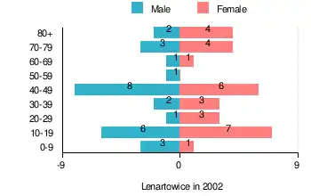 According to the 2002 Poland census, there were 56 people residing in Lenartowice village, of whom 48.2% were male and 51.8% were female. In the village, the population was spread out, with 26.8% under the age of 18, 37.5% from 18 to 44, 8.9% from 45 to 64, and 26.8% who were 65 years of age or older.[1]