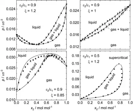 For Lennard-Jones mixtures, both fluid and solid phase equilibria can be studied, i.e. vapor–liquid, liquid–liquid, gas–gas, solid–vapor, solid–liquid, and solid–solid. Accordingly, different types of triple points (three-phase equilibria) and critical points can exist as well as different eutectic and azeotropic points.[67][64] Binary Lennard-Jones mixtures in the fluid region (various types of equilibria of liquid and gas phases)[52][68][69][70][71] have been studied more comprehensively then phase equilibria comprising solid phases.[72][73][74][75][76] A large number of different Lennard-Jones mixtures have been studied in the literature. To date, no standard for such has been established. Usually, the binary interaction parameters and the two component parameters are chosen such that a mixture with properties convenient for a given task are obtained. Yet, this often makes comparisons tricky.