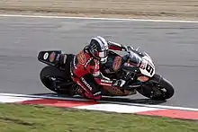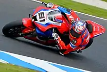 Haslam's results for Stiggy led to Alstare Suzuki signing him to partner Sylvain Guintoli for the 2010 season.[18] He took his first WSBK pole in the 2010 season opener at Phillip Island.[19] He then went on to win his first World Superbike race in race one, narrowly beating Michel Fabrizio by 0.004 seconds at the line in the closest finish ever recorded in a World Superbike race. Haslam was also in control of race two until 3 turns from the end he was overtaken by the eventual winner Carlos Checa. He took two-second places at round 2 in Portugal.[20] These strong results continued in the early part of the season, before a run of four successive wins for Max Biaggi's Aprilia. This led Haslam to publicly ask Suzuki Japan for more resources, to prevent their title challenge from faltering.[21] Haslam beat Biaggi in both Silverstone races, to trim Biaggi's championship lead to 60 points.[22] The championship went down to the penultimate round at Imola
