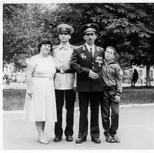 Being a third-generation military man, with his father, and grandfather, both military officers,[d] Khabarov decided to continue the family tradition. He received various assignments to remote places in the Soviet Union. His wife and two sons followed him on his postings. His sons, growing up as military brats, both have followed their father's pathway and, despite their mother's protest, they both enrolled in the Ryazan Airborne School,[a] one after another.[21]