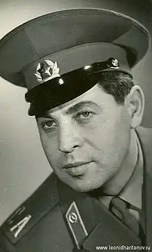 From 9 November 1953 to March 1965 he was a member of the choir in the Red Song and Dance Ensemble of the Soviet Army (later the Alexandrov Ensemble). His place in the choir was always third from the right in the top row. From 1953 to 1955 he served in both the Red Army and the choir. From 1956 to 1959, while still with the choir, he studied at Gnessin State Musical College. His first unofficial public performance as soloist was in the State Kremlin Palace on 18 March 1965. On that day two good friends of his, cosmonauts Pavel Belyaev and Alexei Leonov, traveled into space on the Voskhod 2. During this mission, Leonov became the first human to walk in space. Kharitonov's first official public performance as a soloist was on 22 April 1965.[4] In 1967 he was awarded Honoured Artist of Russia. He continued with the Ensemble until 1972 - so he was with them for nearly 20 years.[1][2][3] B.A. Alexandrov was proud of his soloist, and would often shake his hand or hug him publicly onstage after a performance.[5] Kharitonov sometimes sang duets, but only with Ivan Bukreev.[6] Kharitonov had only one singing teacher in his life: Evgeny Avgustovich Kanger, who taught no-one in the Ensemble but the leading soloists, including Evgeny Belyaev.