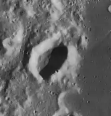 Lepaute is a small lunar impact crater that is located along the western edge of the Palus Epidemiarum, a minor lunar mare in the southwestern part of the Moon's near side. It was named after French astronomer Nicole-Reine Lepaute.[1] To the east is the larger crater Ramsden, within a system of rilles named the Rimae Ramsden. This is an elongated crater feature that is longer in the north–south direction. The outer rim is only slightly worn, and the inner walls are simple slopes that run down to the level, featureless interior floor.