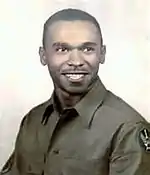 Edwards was drafted in 1943.[2] He was sent to Sheppard Field in Texas and was trained to work on the engines of bombers. Edwards was assigned to the 477th Bomb Group. The group was scheduled to participate in the War in the Pacific, but the war ended before they could be deployed.[3][5] The 477th was sent to Godman Army Airfield in 1945. The 447th bomb group participated in the Freeman Field mutiny.[3] Edwards are honorably discharged in 1946 with the rank of staff sergeant.[2] Edwards never achieved the rank of master sergeant, a rank that in the 1940s was typically held only by white flight chiefs.[2]