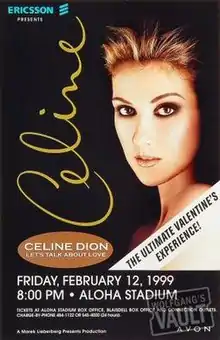 The Let's Talk About Love World Tour was the eighth concert tour by Canadian recording artist Celine Dion. Visiting North America, Asia and Europe; the trek supported Dion's fifth English and fifteenth studio album Let's Talk About Love (1997). and her eleventh French and sixteenth studio album, S'il suffisait d'aimer (1998). The tour marks Dion's last worldwide tour until her Taking Chances World Tour in 2008–2009. Initially planned for 1998, the success of the tour continued into 1999. In 1998, the tour earned nearly $30 million from its concerts in North America alone.[2] In Japan, tickets were immediately sold out on the first day of public sale.[3] It was also nominated for "Major Tour of the Year" and "Most Creative Stage Production" at the Pollstar Industry Awards.[4] According to Pollstar, the tour grossed about $91.2 million from 69 reported shows. The total gross for its overall 97 dates is estimated at $133 million, making it the highest-grossing female tour of the 1990s.[1]