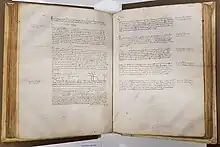 The volumes derive their name from being lettered from A to Z (with two odd volumes marked respectively &c. and AB) and again from AA to ZZ.[3] Besides being known by distinctive letters, the earlier Letter-Books originally bore other titles, derived from the comparative size of each volume and the original colour of its binding.[lower-alpha 1] Letter-Book A is referred to as the "Lesser Black Book" (Parvus or Minor Liber Niger); Letter-Book B as the "Black Book" (Liber Niger); Letter-Book C as the "Greater Black Book" (Major or Maximus Liber Niger); Letter-Book D as the "Red Book" (Liber Rubeus); and Letter-Book E as the "White Book" or "New White Book of Writs and Memoranda" (Liber Albus or Liber Albus novus de brevibus et memorandis).[4]