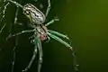 Leucauge venusta, known as the orchard orbweaver spider, is a long-jawed orbweaver spider that occurs from southern Canada to Colombia, along the East coast, reaching into the central US, also in South Asia. The web is often oriented horizontally, with the spider hanging down in the center.