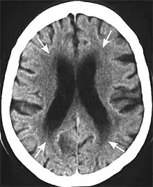 Leukoaraiosis is a particular abnormal change in appearance of white matter near the lateral ventricles. It is often seen in aged individuals, but sometimes in young adults.[1][2] On MRI, leukoaraiosis changes appear as white matter hyperintensities (WMHs) in T2 FLAIR images.[3][4] On CT scans, leukoaraiosis appears as hypodense periventricular white-matter lesions.[5]