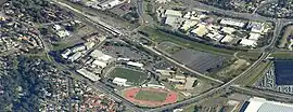 ![]() Aerial image of Leumeah; the railway station is on the top left corner; Campbelltown Stadium is towards the right and Mosaic Buildings on the left | |||||||||||||||