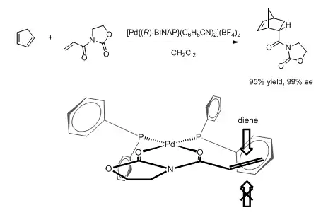 Based on the structure, models for the observed enantioselectivity in many BINAP-based Lewis acid-catalyzed reactions have been proposed. For example, in the palladium-catalyzed enantioselective Diels-Alder reaction shown below, the dienophile is thought to coordinate the metal center at the equatorial sites. Thus the equatorial phenyl group on phosphorus obstructs the Si-face, resulting in excellent enantioselectivity.[56] A very similar model was used to rationalize the outcome of a nickel-catalyzed asymmetric enolate alkylation reaction, where the substrate also bears an auxiliary that allows it to chelate onto the metal.[57] On the other hand, a copper(I)-catalyzed hetero-ene reaction is thought to proceed through a tetrahedral intermediate,[58] offering an alternative mode of stereoinduction by changing the metal center.