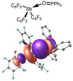 Since Lewis adducts are formed by dative bond between Lewis bases and Lewis acids, the orbital overlap between the Lewis base and σ*(Sb–X) orbital is the source of the acidity. According to Gabbaï et al., NBO analysis of the Sb(C6F5)3P(O)Ph3 adduct indicates a donor-acceptor interaction between lp(O) and σ*(Sb–C6F5).[7][8]