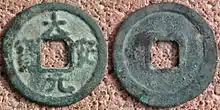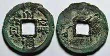 Liao dynasty coins (like some contemporary Song dynasty coins) can be read top-right-bottom-left (clockwise), but unlike the Song's coinage never appeared top-bottom-right-left. Liao dynasty era coins have appeared in both Chinese and Khitan scripts.[3][4] The coins in Khitan script do tend to have different character orders,[5] Though these coins weren't meant for circulation.[6]