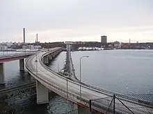 The island Lidingö is connected to the city of Stockholm by the two bridges of Lidingöbron. One is for cars and one for the Lidingöbanan suburban tramway and pedestrians. The bridges lead directly to Ropsten, a station on the Stockholm Metro.