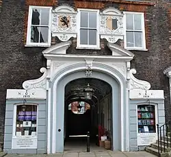 The Gatehouse from Chancery Lane is the oldest existing part of the Inn, and was built between 1518 and 1521.[49] The Gatehouse was mainly built thanks to the efforts of Sir Thomas Lovell, the Treasurer at the time, who provided at least a third of the funds and oversaw the construction itself—as a result, his coat of arms hang on the gate, along with those of the Earl of Lincoln and Henry VIII (the king at the time).[50]