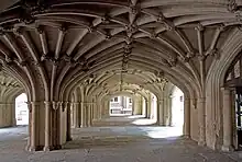 The first mention of a chapel in Lincoln's Inn comes from 1428. By the 17th century, this had become too small, and discussions started about building a new one in 1608.[36] The current chapel was built between 1620 and 1623 by Inigo Jones, and was extensively rebuilt in 1797 and again in 1883. Other repairs took place in 1685, after the consultation of Christopher Wren, and again in 1915. The chapel is built on a fan-vaulted, open undercroft[37] and has acted (sometimes simultaneously) as a crypt, meeting place and place of recreation. For many years only Benchers were allowed to be buried in the Crypt, with the last one being interred on 15 May 1852. Before that, however, it was open to any member or servant of the society; in 1829 a former Preacher was interred, and in 1780 William Turner, described as "Hatch-keeper and Washpot to this Honble. Society", was buried.[38]