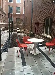 The entire exterior of the building was restored including the slate of roof tiles, windows, brick mortar, detailing, and the 30 terra cotta panels depicting quotes and portraits from Abraham Lincoln's life. On the Wright Street side of the building, the old carriage porch was restored into the formal entrance for the building.