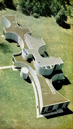 The house's exterior walls curved outward, stopping abruptly at the sides. The walls spread outward as if continuing on. The roof had varying levels and numerous skylights, in ellipses, circles, half-moons, and ribbons.[2]