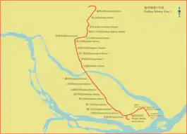 Line 1 of Fuzhou Metro (simplified Chinese: 福州地铁1号线; traditional Chinese: 福州地鐵1號線; pinyin: Fúzhōu Dìtiě Yī Hào Xiàn) is a north-south line of the Fuzhou Metro network in Fuzhou, Fujian Province, China. This line is the first operating metro line in the Fuzhou Metro system, inaugurated on May 18, 2016.[1] By June 2016, the south section, running from Sanchajie to Fuzhou South, is in operation.[2] The north section opened on 6 January 2017. This line is colored red on system maps.