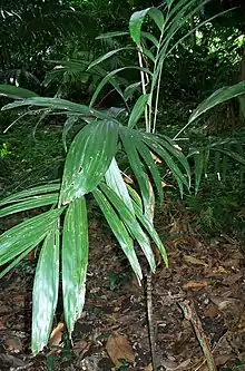 Linospadix minor (also known as Bacularia intermedia), more commonly known as the minor walking stick palm (being smaller in stature than the walking stick palm Linospadix monostachyos ) is a small North-East Queensland tropical forest palm with stems between 7mm and 20mm in diameter, growing from 1 m to 5 m high, with semi-glossy dark green leaves, and a crown of 7 to 12 leaves [1]