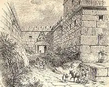 The gate stood in full view of visitors to Mycenae for centuries. It was mentioned by the ancient geographer Pausanias in the second century AD.[15] The first correct identification of the gate in modern literature was during a survey conducted by Francesco Grimani, commissioned by the Provveditore Generale of the Kingdom of the Morea in 1700,[16] who used Pausanias's description of the gate to identify the ruins of Mycenae.[17][18][19]