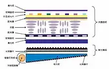 Most color LCD systems use the same technique, with color filters used to generate red, green, and blue subpixels. The LCD color filters are made with a photolithography process on large glass sheets that are later glued with other glass sheets containing a thin-film transistor (TFT) array, spacers and liquid crystal, creating several color LCDs that are then cut from one another and laminated with polarizer sheets. Red, green, blue and black photoresists (resists) are used. All resists contain a finely ground powdered pigment, with particles being just 40 nanometers across. The black resist is the first to be applied; this will create a black grid (known in the industry as a black matrix) that will separate red, green and blue subpixels from one another, increasing contrast ratios and preventing light from leaking from one subpixel onto other surrounding subpixels.[6] After the black resist has been dried in an oven and exposed to UV light through a photomask, the unexposed areas are washed away, creating a black grid. Then the same process is repeated with the remaining resists. This fills the holes in the black grid with their corresponding colored resists.[7][8][9] Another color-generation method used in early color PDAs and some calculators was done by varying the voltage in a Super-twisted nematic LCD, where the variable twist between tighter-spaced plates causes a varying double refraction birefringence, thus changing the hue.[10] They were typically restricted to 3 colors per pixel: orange, green, and blue.[11]