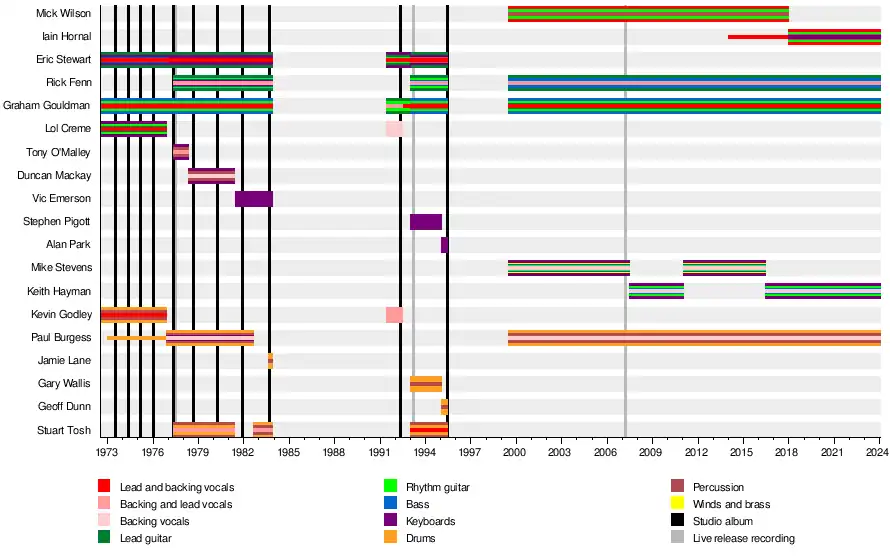 Gouldman reformed 10cc as a touring-only band in 1999, with Fenn and former drummer Paul Burgess returning, alongside new members Mick Wilson on vocals, percussion and guitar, and Mike Stevens on keyboards, saxophone, bass and guitar.[12] Shortly after the tour which spawned live album Clever Clogs, Stevens left to become Take That's musical director, at which point Keith Hayman took over on keyboards.[15] Stevens returned in 2011,[16] before Hayman returned again in 2016.[17] In December 2017, Wilson was replaced by Iain Hornal, who had previously toured with the band[18] and with Stevens in Jeff Lynne's ELO. Though dates in 2018 featured singer Paul Canning.[19][20]