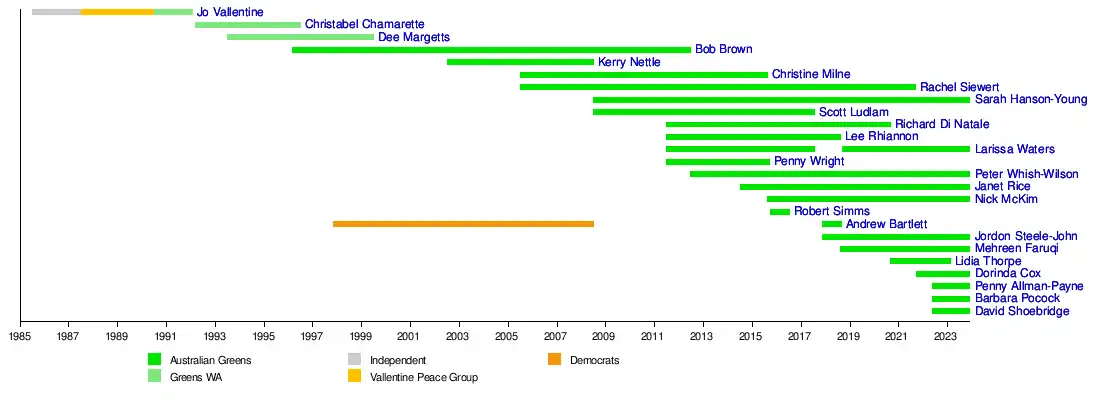 The table below represents the parliamentary representation of Greens politicians from 1983 to the present. Bob Brown was the first elected Greens representative, initially elected to the Tasmanian House of Assembly in 1983. He was joined by Gerry Bates in 1986.