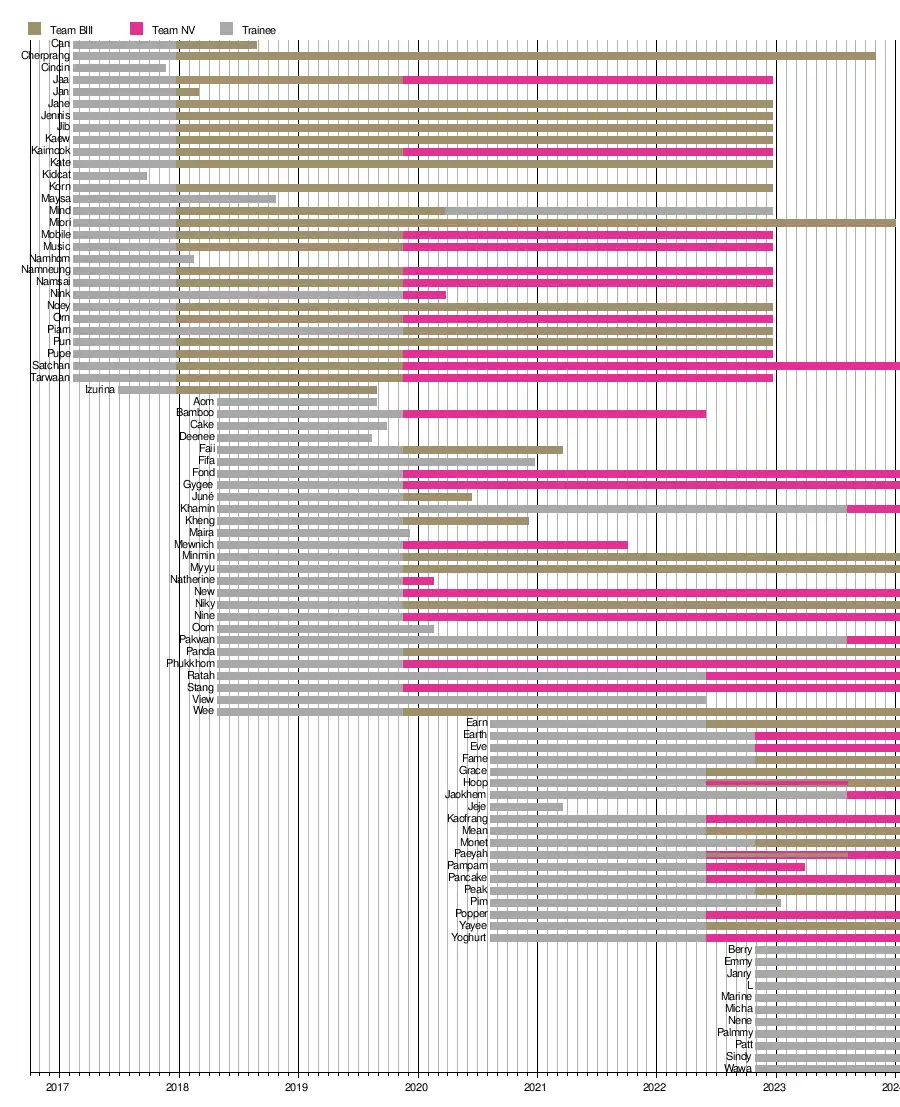 The original members of the group were recruited in mid-2016 and were announced in early 2017, comprising a total of 30 people. The second-generation 27 additional members were announced on 29 April 2018.[1] On 9 August 2020, 19 third-generation members were announced.[2] On 30 October 2022, 11 fourth-generation members were announced.[3] Some members have left the group in the process known as graduation. As of August 2023, the group consists of 42 members, of whom 13 constitute Team BIII, 18 constitute Team NV, and the rest is categorised as trainees.[4][5][6]