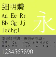 華康中明體華康粗明體 TC Microsoft Windows Font family from which Windows 3.0's default Traditional Chinese font 'Ming Light' is derived.