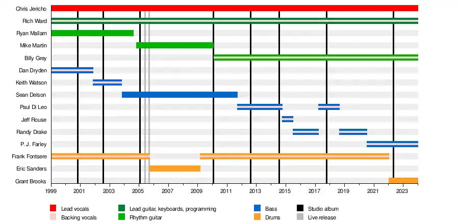 In February 2010, it was reported that Martin had left Fozzy, which he claimed happened in August 2009 due to "a personal falling out between me and one of the band members over business matters".[15] The guitarist was replaced by the returning Billy Grey, now an official member of the band.[16] Delson left after the subsequent promotional touring cycle due to musical differences, with Paul Di Leo taking his place in September 2011.[17] Di Leo performed on 2012's Sin and Bones and 2014's Do You Wanna Start a War, but was replaced in September 2014 by Loaded bassist Jeff Rouse.[18] Rouse was later replaced by Randy Drake,[19] before Di Leo returned in early 2017 to record Judas.[20] In September 2018, a Fozzy tour was announced which listed Drake returning as the band's touring bassist.[21] Drake would, once again, leave the band in 2020.[22] He would be replaced by P. J. Farley of Trixter.