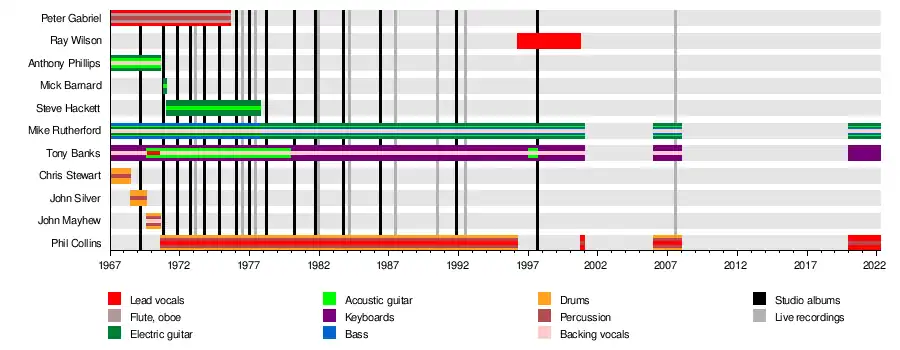 Genesis were an English progressive rock band from Godalming, Surrey. Formed in January 1967, the group originally consisted of lead vocalist and flautist Peter Gabriel, guitarist Anthony Phillips, bassist and guitarist Mike Rutherford, keyboardist Tony Banks and drummer Chris Stewart. The band's most recent lineup featured constant members Rutherford and Banks, alongside drummer and vocalist Phil Collins (who first joined in 1970), augmented for live shows by touring musicians, bassist and guitarist Daryl Stuermer, drummer Nic Collins and backing vocalists Daniel Pearce and Patrick Smyth.