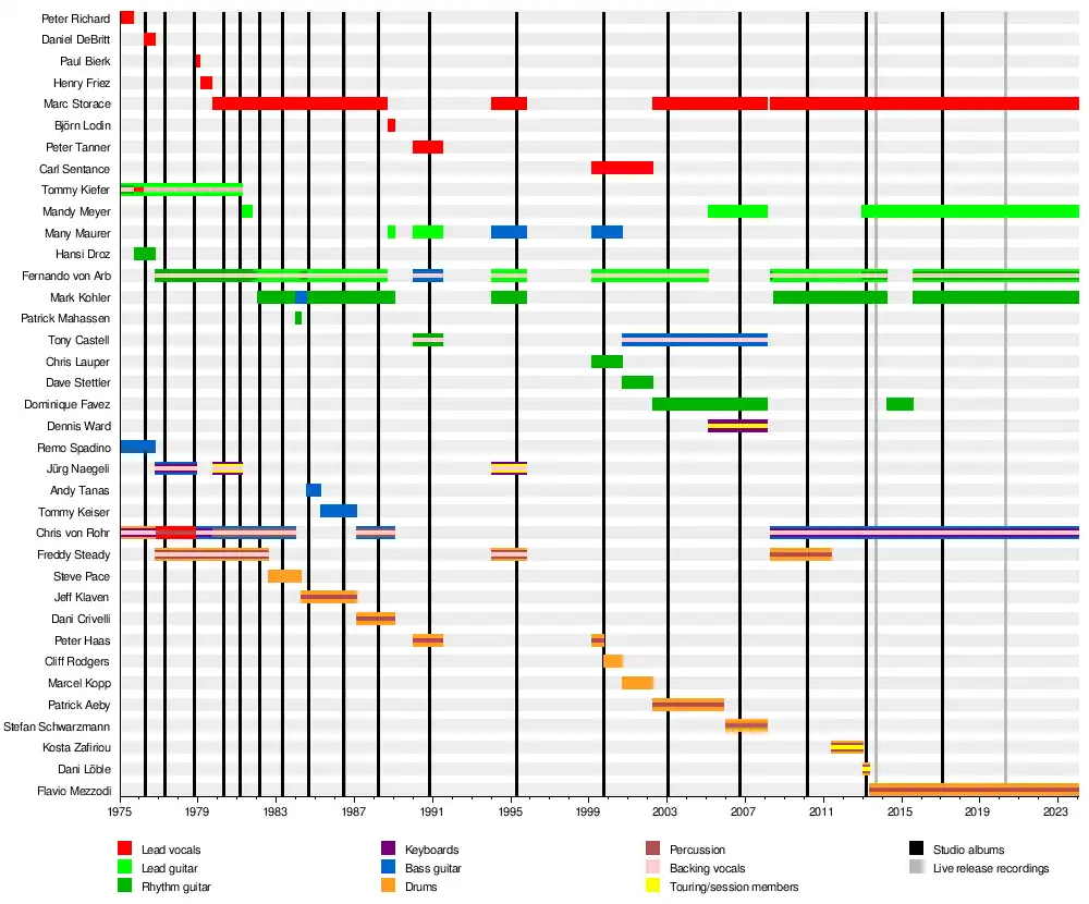 Krokus are a Swiss hard rock band from Solothurn. Formed in 1975, the group originally consisted of lead vocalist Peter Richard, guitarist Tommy Kiefer, bassist Remo Spadino and drummer Chris von Rohr. By the time of the release of their self-titled debut album, Kiefer had taken over lead vocal duties, and Hansi Droz was the rhythm guitarist. The band's current lineup features von Rohr on bass guitar/keyboards/backing vocals (1975–1983, 1987–1989, and since 2008), lead vocalist Marc Storace (1979–1988, 1994–1999, and since 2002), lead guitarists Fernando von Arb (1976–1989, 1994–1995, since 2008) and Mandy Meyer (1981, 2004–2008, 2012—2014, and since 2015), rhythm guitarist Mark "Koki" Kohler (1982–1989, 1994–1995, 2008–2014, and since 2015) and drummer Flavio Mezzodi (since 2013).