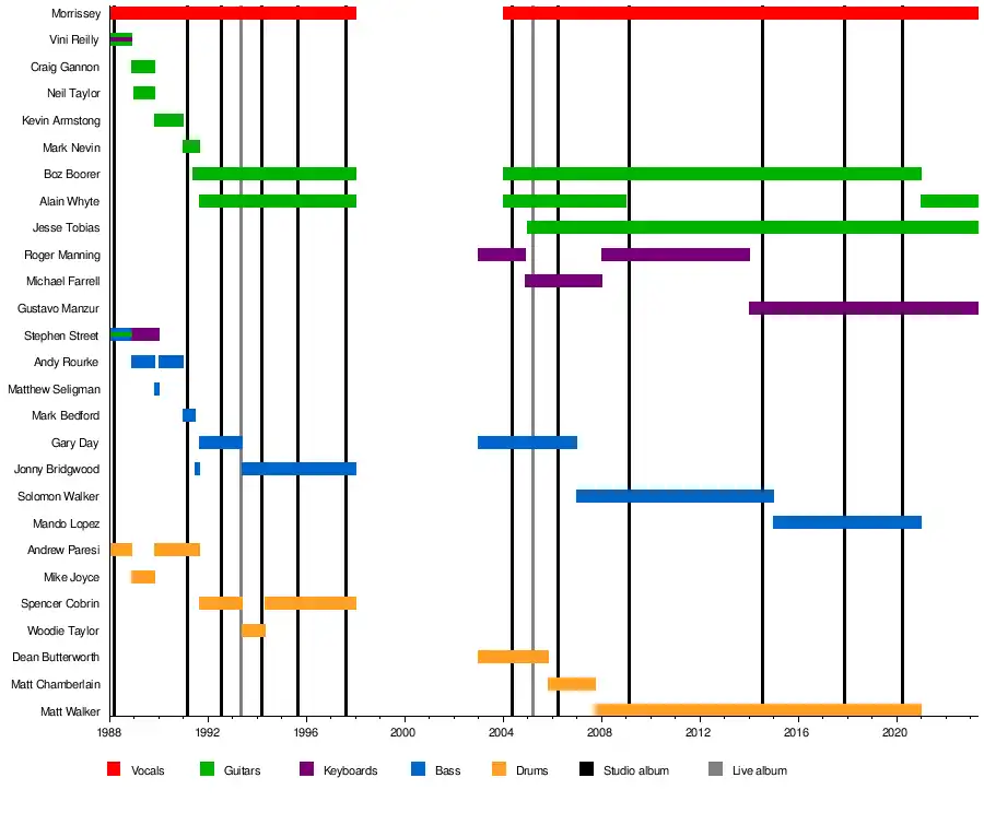 Alain Whyte | 1991-2009, 2021-2023 | guitar, backing vocals | All Morrissey releases from Your Arsenal to Ringleader of the Tormentors. He co-wrote a plurality of tracks on Years of Refusal but did not perform on that album. |